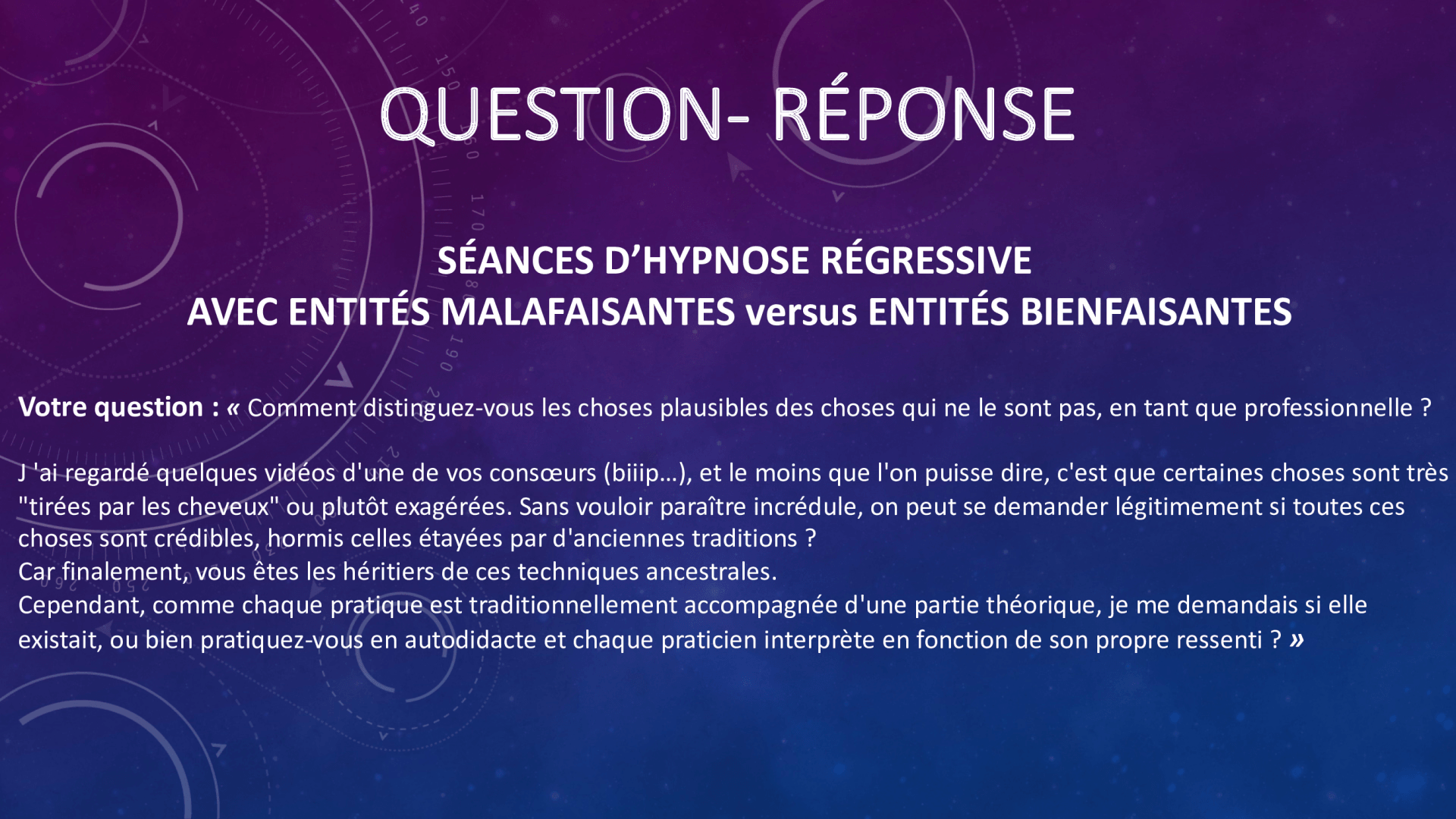 Quand j’ai commencé à m’intéresser à l’hypnose régressive, je me suis intéressée à ce que tous les autres faisaient et finalement nous sommes encore très peu nombreux à diffuser l’information reçue. Et effectivement on retrouve beaucoup l’équipe X dont (biiiip) fait partie et dont les séances sont accès "extraterrestres malfaisants". A côté de cela, il y a des hypnothérapeute comme moi qui ont des séances pas du tout accès sur les « extraterrestres malfaisants »…mais plus accès sur la conscience supérieure de la personne et sa rencontre avec ses proches décédés et ses guides.